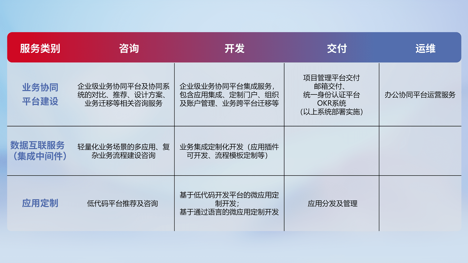 针对钉钉、、、、企微、、、IDaas等平台级产品提供产品的规划、、、方案、、交付、、、定制化开发等服务,,,,实现如统一协同办公、、、智能客户服务、、、、混合会议管理、、智能数据查询、、、等业务场景,,实现数字化转型。。