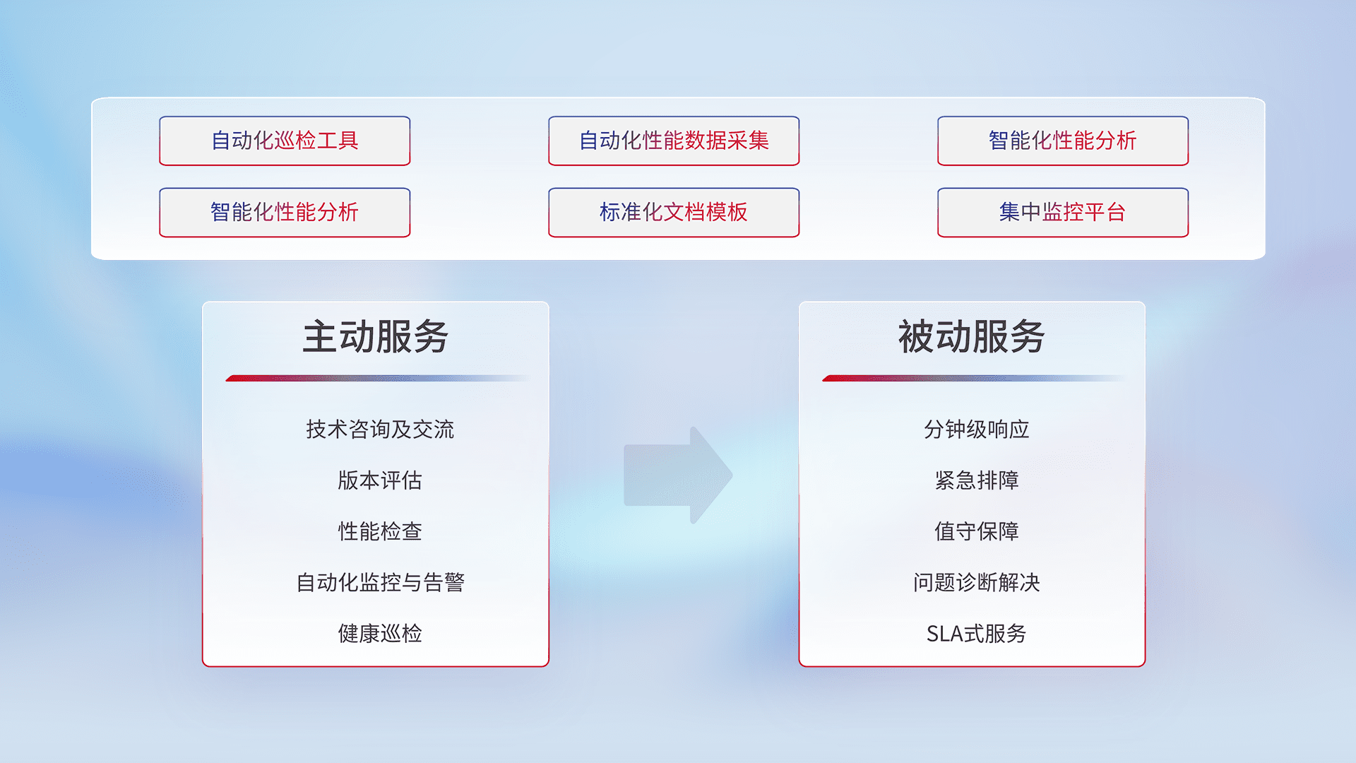 智能化工具和标准化文档,,,,保障服务质量,,提供主动服务(包含技术咨询、、版本评估、、性能检查、、自动化监控与告警、、、健康巡检)和被动服务包含(分钟级响应、、紧急排障、、、、值守保障、、、、问题诊断解决、、、、SLA服务)。。。