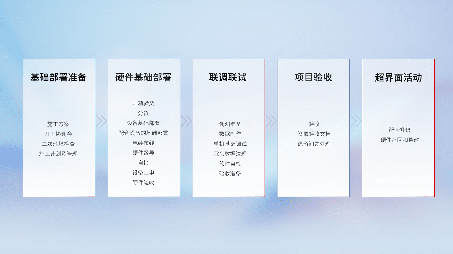 从基础部署准备、、硬件基础部署、、、、联调联试、、、项目验收、、、、越界面活动的全过程可追溯,,,保证施工质量和进度。。。